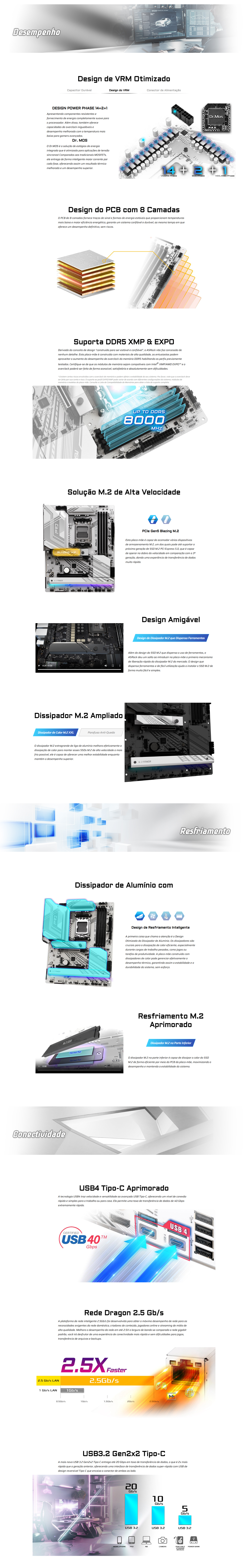 - 14+2+1 fases de alimentação, Dr.MOS de 80A para VCore+SOC+MISC com proteção de dissipador de calor ampliada