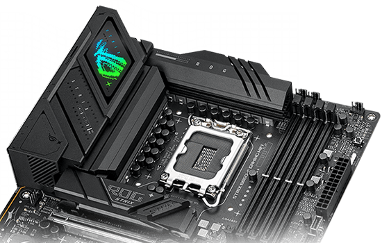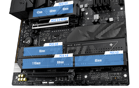 O Strix B860-F oferece suporte PCIe 5.0 de ponta a ponta, e o slot de expansão x16 mais alto é protegido com um suporte de retenção SafeSlot para suportar o peso das placas de vídeo mais recentes. Um slot M.2 integrado é classificado para velocidades de leitura e gravação de até 16 GB/s, enquanto o restante pode fornecer transferências ainda impressionantes de 8 GB/s. E cada slot M.2 é coberto com dissipadores de calor substanciais para despachar o calor das unidades de última geração.
