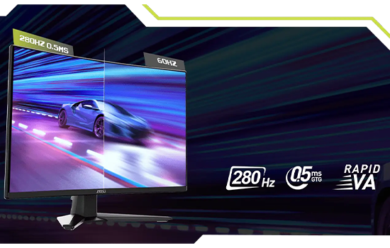 Conta com uma taxa de atualização de 280Hz e tempo de resposta de 0,5ms (GtG, Mín.). Uma enorme vantagem em jogos de ritmo acelerado, como jogos de tiro em primeira pessoa, jogos de luta, simuladores de corrida, estratégia em tempo real e esportes.