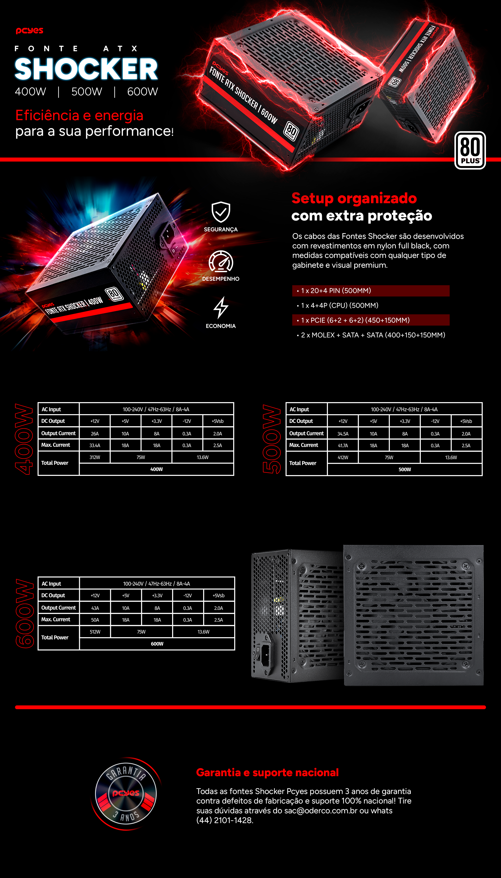 Fonte PCYes Shocker, 500W, 80 Plus White, PFC Ativo, Preto, PF500SHW