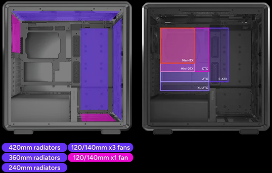 Suporta placas-mãe Mini-ITX a E-ATX, oferecendo compatibilidade com uma ampla variedade de compilações e configurações. Pode acomodar até onze ventoinhas e vários tamanhos de radiadores (até 420 mm), garantindo desempenho térmico superior.
