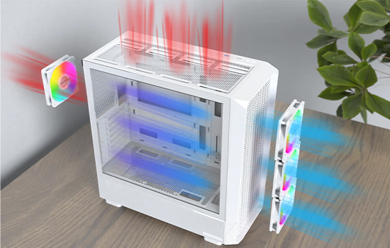 Pré-instalado com 4 ventoinhas ARGB, com 25 modos de iluminação integrados ao toque de um botão ou controle total com a placa-mãe proporcionando resfriamento potente e iluminação vibrante.