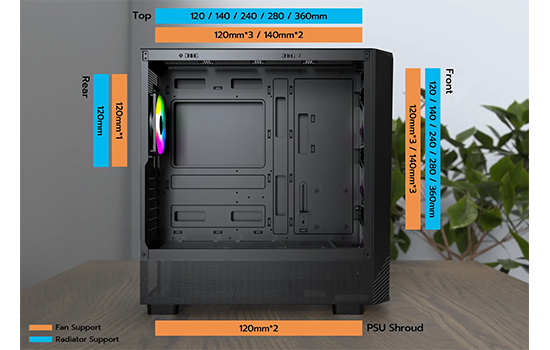 Com suporte AIO de 360 ​​mm nas montagens superior e frontal, o X5 oferece desempenho de resfriamento superior, superando o limite de 240 mm do X3 para manter sistemas de alto desempenho funcionando em temperaturas ideais.