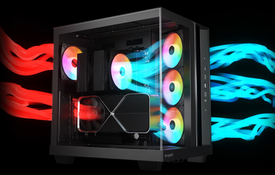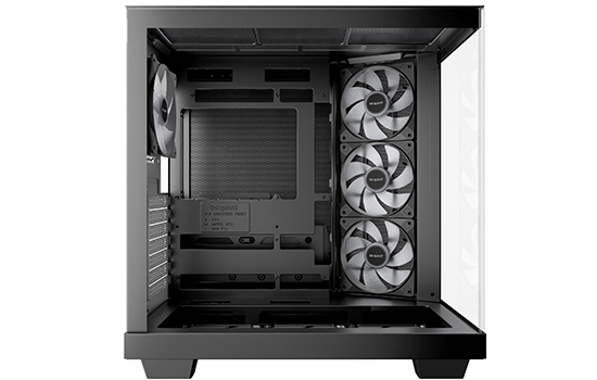 O Light Base 500 conta com 4 ventoinhas Pure Wings 3 pré-instaladas . A ventoinha de exaustão traseira é uma Pure Wings 3 PWM de 120 mm, e as ventoinhas de admissão laterais são ventoinhas Pure Wings 3 PWM de 120 mm com pás invertidas. Todas as ventoinhas são otimizadas para o máximo fluxo de ar, reduzindo simultaneamente as turbulências geradoras de ruído com suas pás de formato especial. As pás invertidas garantem que seu lado bonito esteja sempre visível.