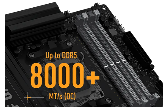 Opções abrangentes de ajuste de memória são a base das placas-mãe TUF GAMING. Com a placa-mãe, você pode extrair todo o potencial dos seus módulos DDR5*, sejam eles de um kit de velocidade extrema ou de um conjunto básico que, de outra forma, ficaria bloqueado.