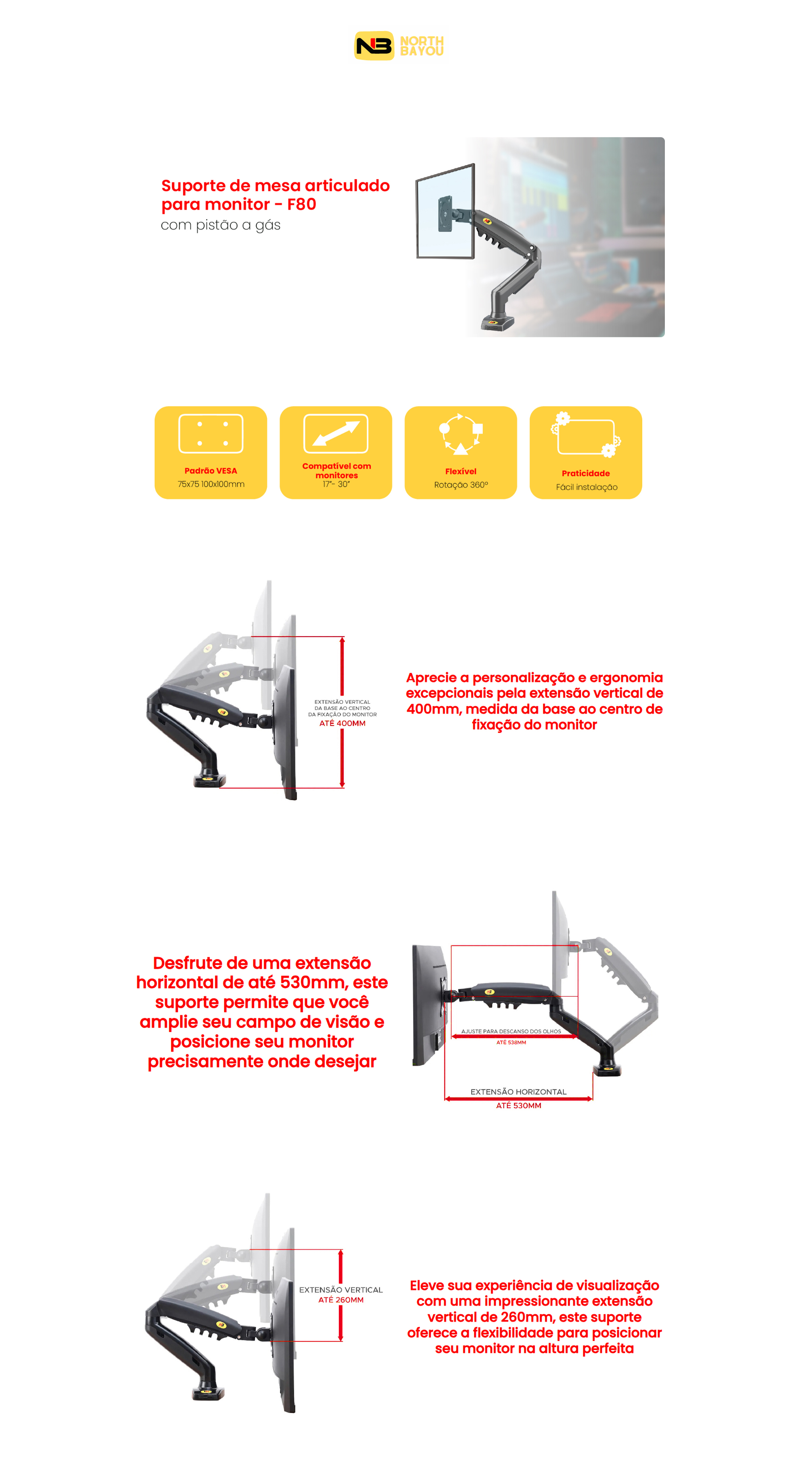 Suporte de Mesa North Bayou F80, Articulado, Com Pistão, Para Monitores 17 Até 30 Pol, Preto/Cinza