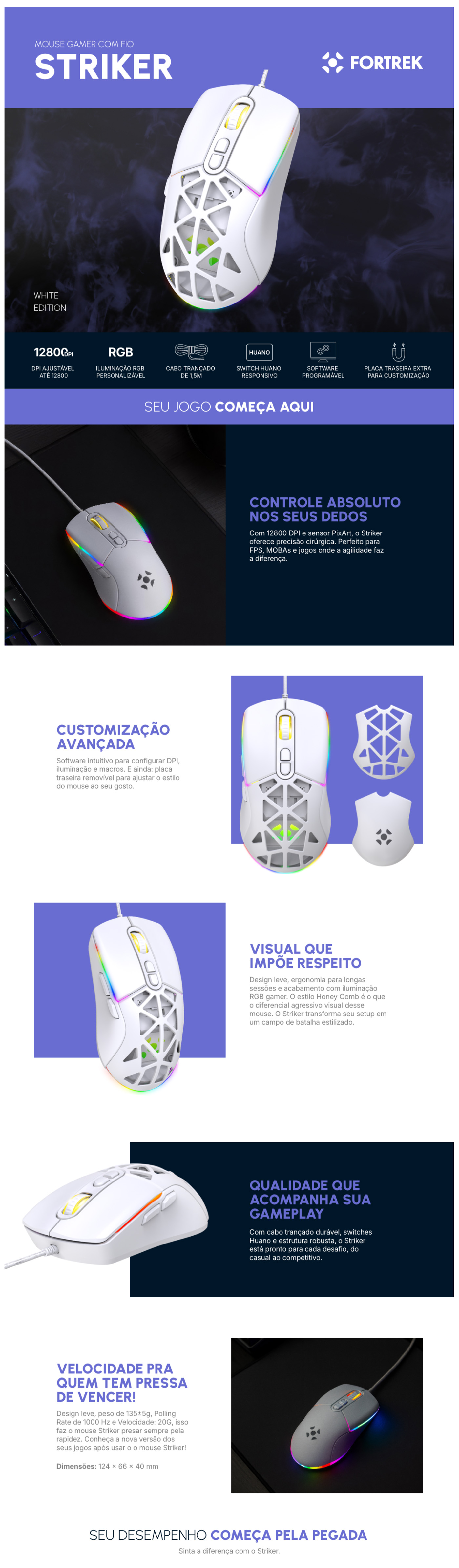 DPI: 800-1600-2400-4800-6400-12800 DPI • Peso:135±5g (com cabo) • Placa traseira extra para customização • Switch: HUANO • Quantidade de cliques: 10 milhões